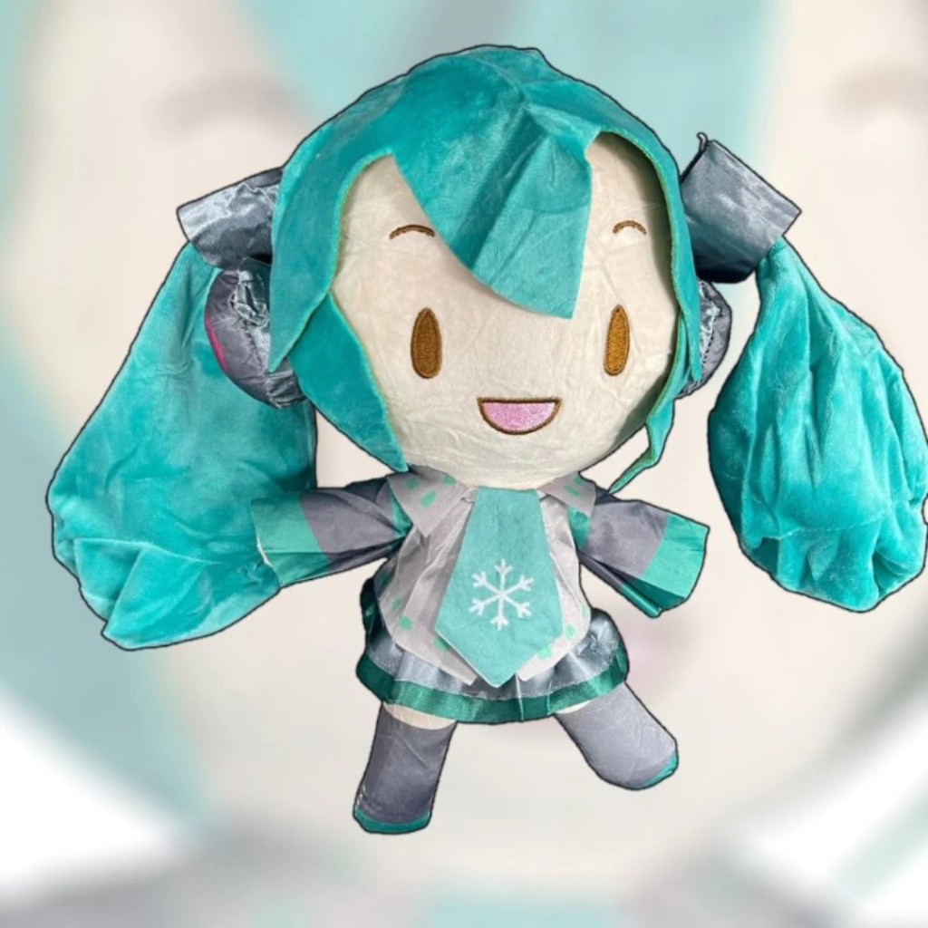 ¡La idol virtual más famosa del mundo se viste de invierno! ❄️ Esta versión "Snow Miku" tiene detalles súper kawaii, con su trajecito de copito de nieve y colores brillantes. Mide 26 cm y está confeccionada con tela suave y detalles bordados.