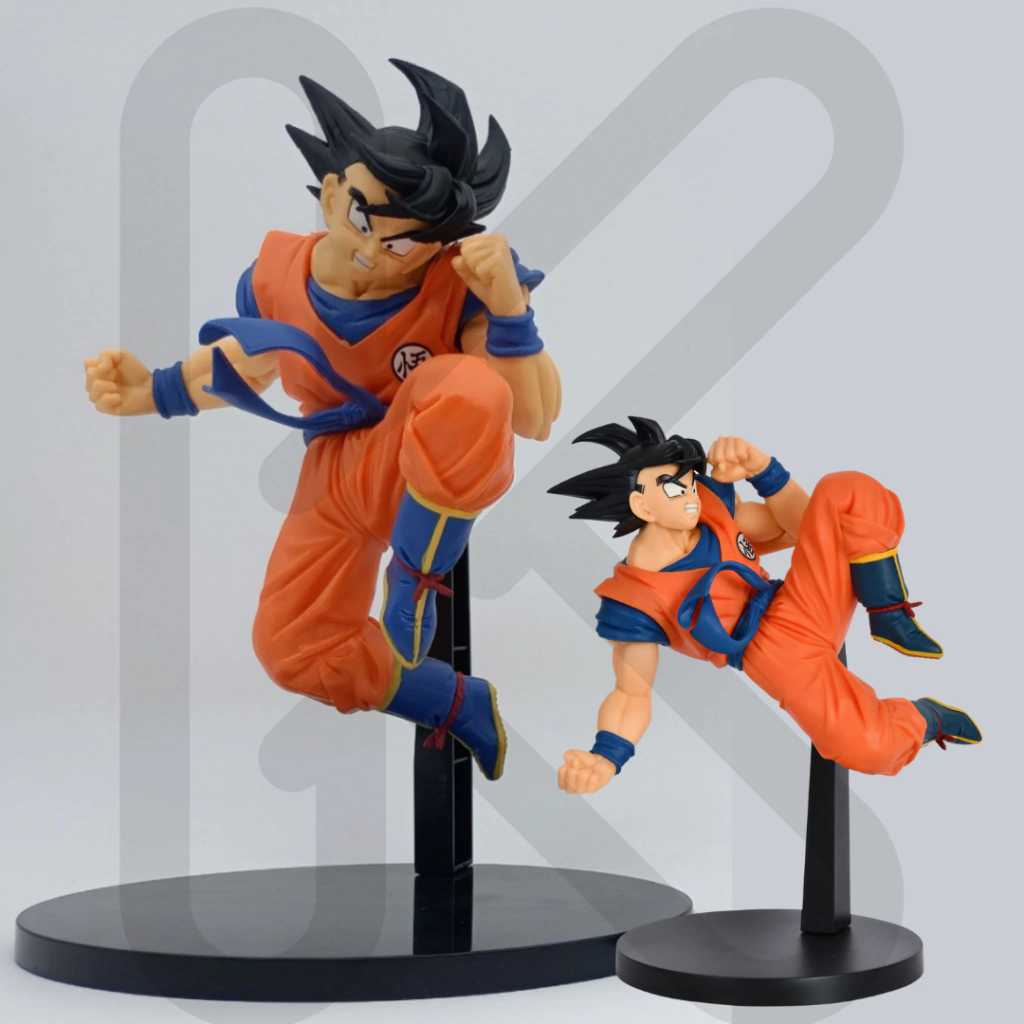 Figura de Son Goku inspirada en Dragon Ball Z, mostrando al personaje en plena acción con su clásico traje naranja y el símbolo “Go” en el pecho. Esta versión bootleg (no original) reproduce la pose del enfrentamiento contra Vegeta de la línea Match Makers, con un gran nivel de detalle para su tamaño.