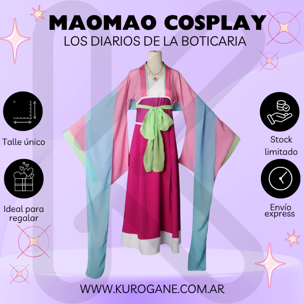 Elegancia, color y tradición en un solo conjunto 💮 Este hermoso cosplay de Maomao captura el estilo distintivo de la protagonista de Los Diarios de la Boticaria, con mangas amplias y tonos suaves que reflejan su esencia única. Ideal para eventos, sesiones de fotos o simplemente para quienes aman el anime histórico con estilo ✨